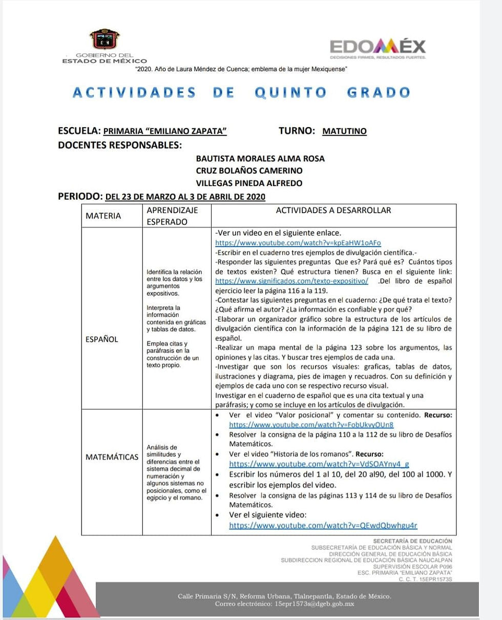 Profesores de 5 Grado de primaria. Actividades a realizar.